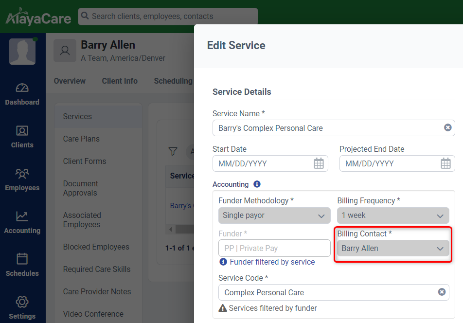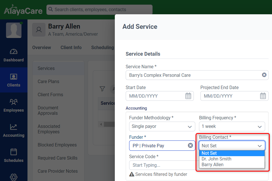 In the example below we are able to assign either Barry (client) as the Billing Contact or his primary care physician Dr. John Smith (client contact) as a Billing Contact for this service.
