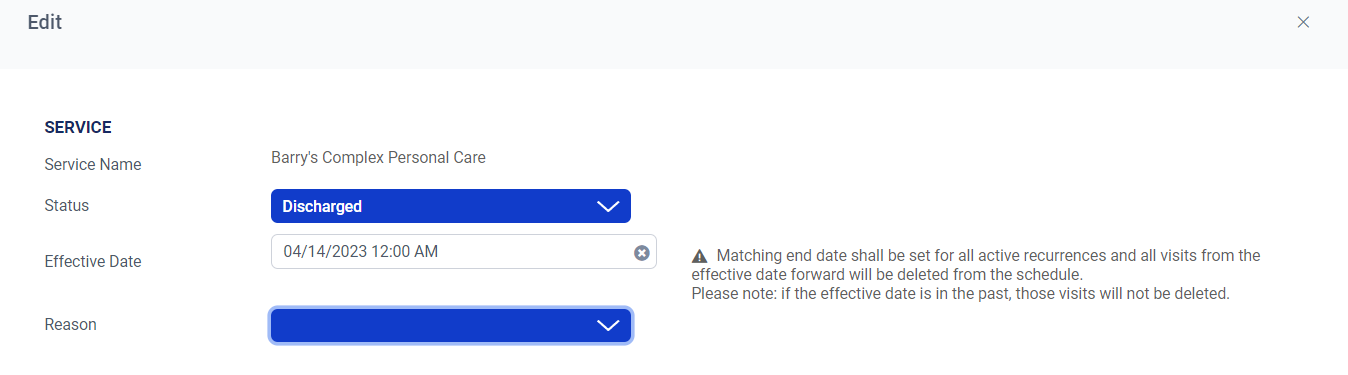 Otherwise, if there is a long record of invoices and visits requiring updates you will need to discharge the service and create a new one with the correct contact. To discharge the previous service with the old Billing Contact, select the client service link, and on the next page choose the Status bar to update the information.