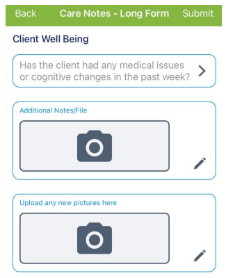 3. Client Well Being: An answer to “Has the client had any medical issues or cognitive changes in the past week?” is required. The caregiver can attach additional files via first camera icon and upload photos via section camera icon.