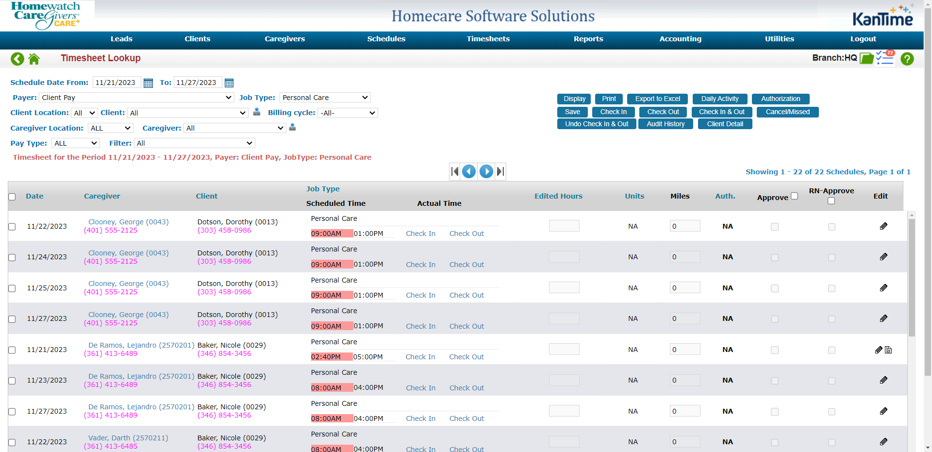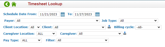The Timesheet Lookup view allows users to review timesheet records within a set date range and specify criteria based on several filter conditions. It is a useful resource and can be utilized for many scenarios including adjustments during invoice/payroll creation, creating a report for a specific client and caregiver to include their shift notes or multi-visit RN Approval for state/LTCi requirements.