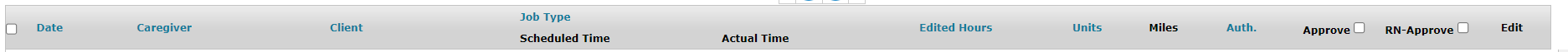 Once the filters are narrowed down, click the 'Display' button to show the results. The information can then be organized (ascending/descending order) by choosing the following blue column headers - Date; Caregiver; Client; Job Type; Edited Hours; Units; Authorization.