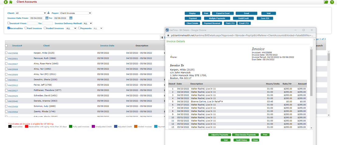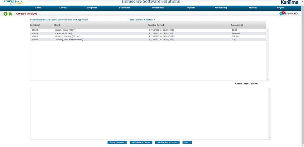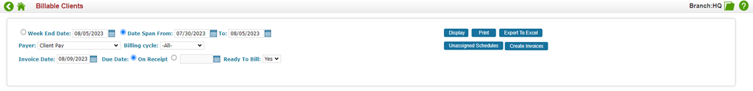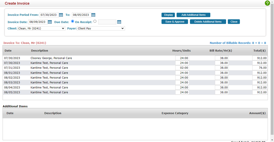 *Disclaimer: Once you hit Display you will see the list of clients in that Date Span and can review each client’s invoice details. If you are comfortable with proceeding and using a batch action to create & approve all clients’ invoices, then you can select ‘Create Invoices’. The steps below will explain how to review invoices in detail prior to creating and approving.