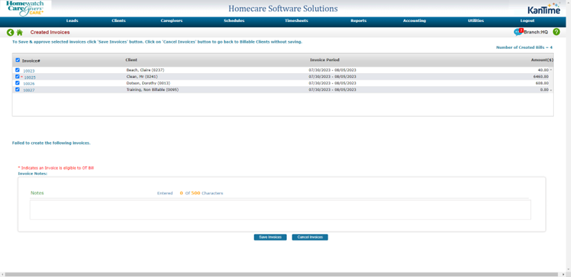 At the bottom of the screen you can save & approve invoices by selecting ‘Save Invoices’, not move forward with a client’s invoice by selecting “Cancel Invoices”, and add any Invoice Notes.