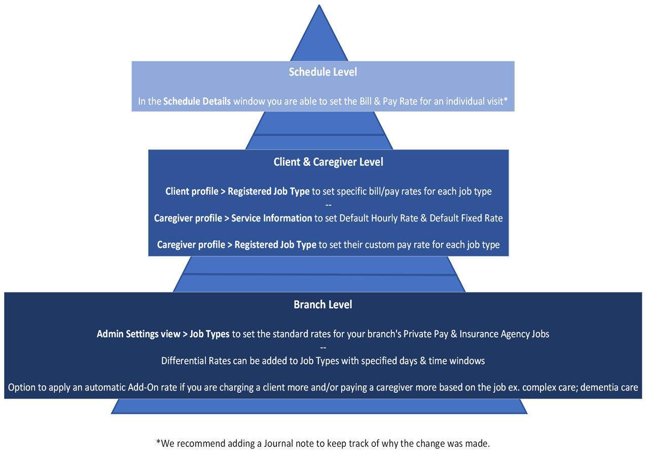 The diagram below presents the hierarchy of bill & pay rates and how Care+ will recognize what rate to choose for the approved visit. By default, the rates configured at the Branch Level will be recognized as the bill & pay rates, unless otherwise specified on the Client & Caregiver Level or Schedule Level.