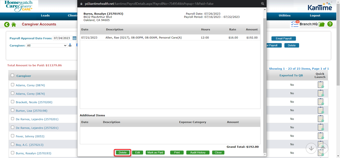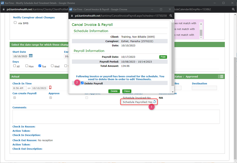 - There will be a Cancel Invoice & Payroll popup and you will also need to check the box to ‘Delete Payroll – please note that you are only deleting the record; if the caregiver has already been paid, then this will not impact anything