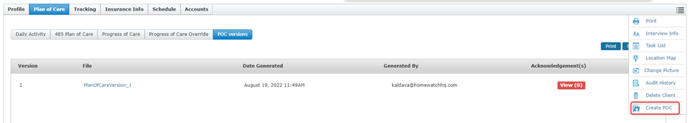 A message will appear that the ‘Plan of Care Generated Successfully’ and the latest version will be added to the list.
