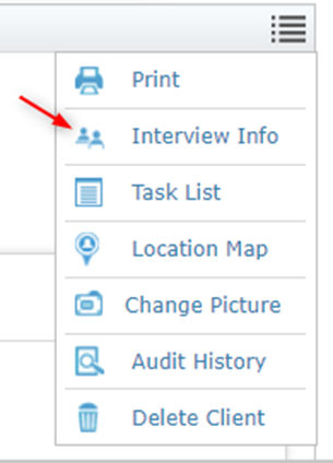 After the client intake is completed and they have been onboarded as a client, this information will be saved to their profile and can be accessed by going to the hamburger icon and selecting ‘Interview Info’.