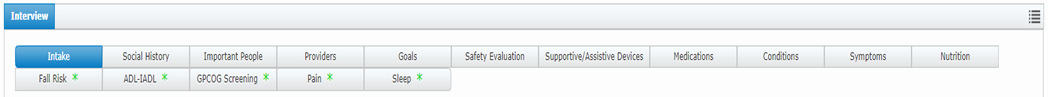 The Fall Risk, ADL-IADL, GPCOG Screening, Pain & Sleep tabs all have an asterisk which indicates they have scoring fields. These scores can be used to run reports on your clients and see any changes, whether it be progression, regression, or stabilization of those areas and help you determine next steps such as reviewing the type of service being received by the client and updating their Plan of Care. This information can be shared with the client’s healthcare provider for further evaluation as indicated.