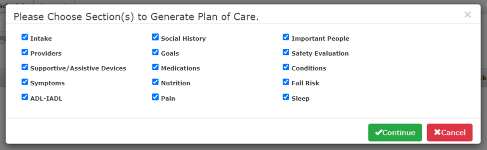 You will then choose from the following sections to generate this client’s Plan of Care. If this is your first time creating the PoC, the details from the client Intake will be captured in the documented sections. If other information or changes need to be added, refer to the previous section for ‘Updating Client Details’.