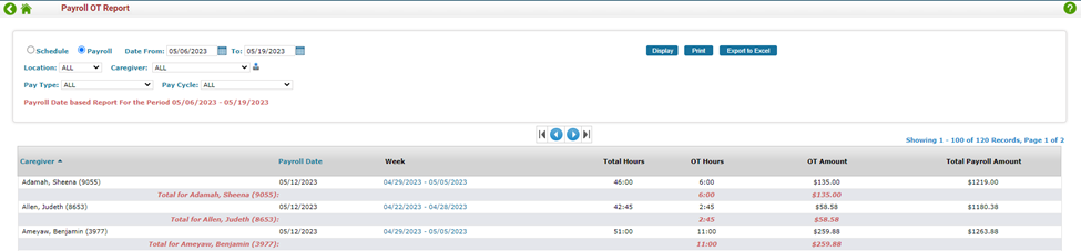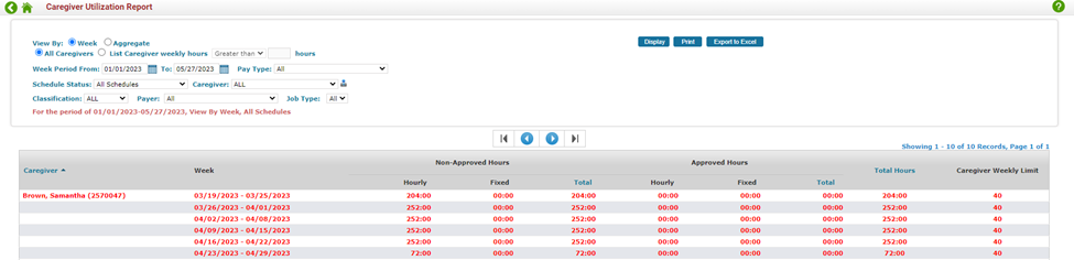 This report can be used to identify which caregivers are in overtime, so you can adjust accordingly, and to identify caregivers that may have capacity to work additional hours.
