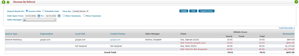 This report illustrates the amount of revenue by referral source for a given timeframe.