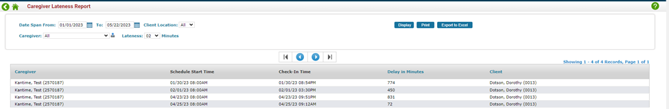 This report provides a listing of caregivers and the total number of minutes late by client for each shift.