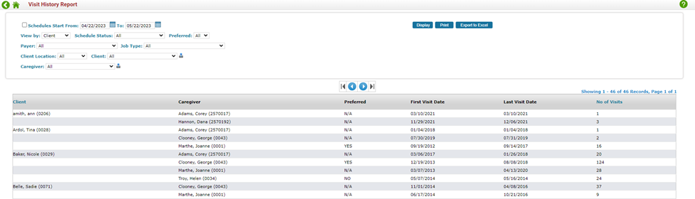 This report illustrates how many caregivers have been to each client with their total number of visits.